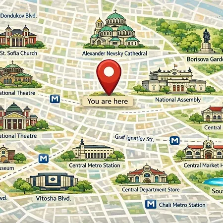 Narodowa Galeria Sztuki jest mniej niż 1 km, a Stadion Narodowy im. Wasyla Lewskiego jest w bliskiej odległości od tego apartamentu. Z obiektu można w 10 min dojść do centrum miasta. W niewielkiej odległości od apartamentu Exceptional Refurnished Studio Top Location leży Uniwersytet Sofijski im. Św. Klemensa z Ochrydy.